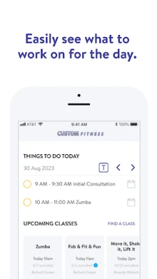 With the Custom Fitness App, you can manage your membership details, book appointments, and sign up for classes as you work to achieve your fitness goals.